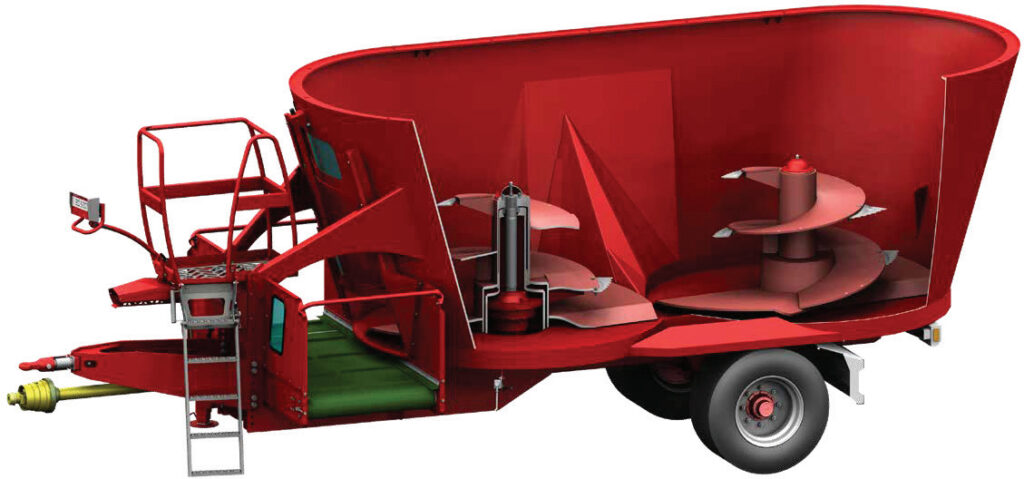 균일한 품질의 배합을 위한 독특한 사료 탱크 비대칭형 뒤집어 놓은 원뿔 형태는 사료가 수평 방향으로도 배합 되도록 합니다. 소위 2중 흐름 Dual flow 원리는 사료를 최적의 상태로 고르게 배합하며 빠르고 일정하게 배출합니다.