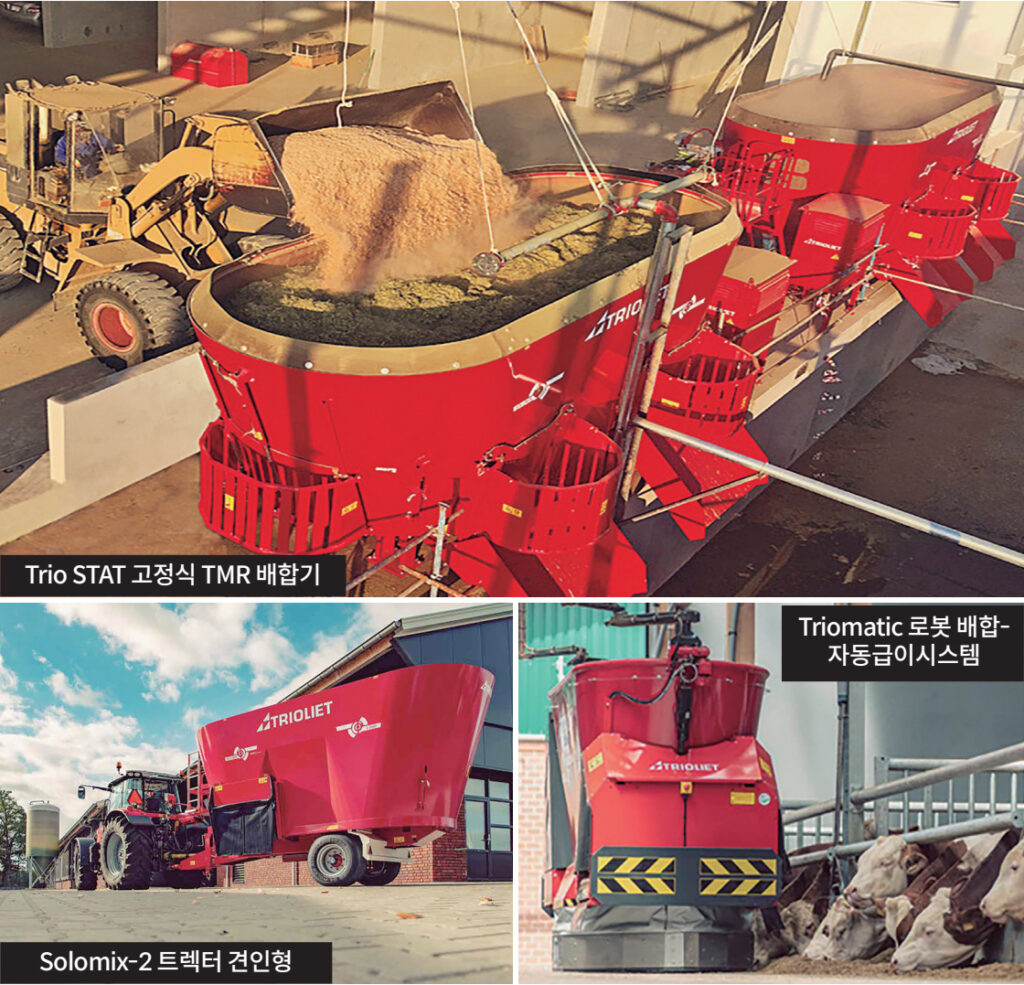 낙농왕국 네덜란드에 자리잡은 70년 역사의 트리오리에 Tiroliet사는 고정식, 트랙터 견인식 수직 오가 TMR 배합기를 개발, 세계 50개국으로 수출하고 있는 세계 최대의 버티칼 TMR 배합기 제조사로, 수년전 배합과 우사내 자동급이를 동시 수행하는 로봇 배합·급이 시스템도 개발, 유럽을 비롯한 미국, 일본 등 세계 각국에 성공적으로 보급하고 있으며, 또한 농장용은 물론 공장용 TMR 배합기, 원료를 배합기에 자동투입하는 TMR 키친, 건초더미를 절단, 배합기에 자동투입하는 연관기종들도 공급하고 있습니다.